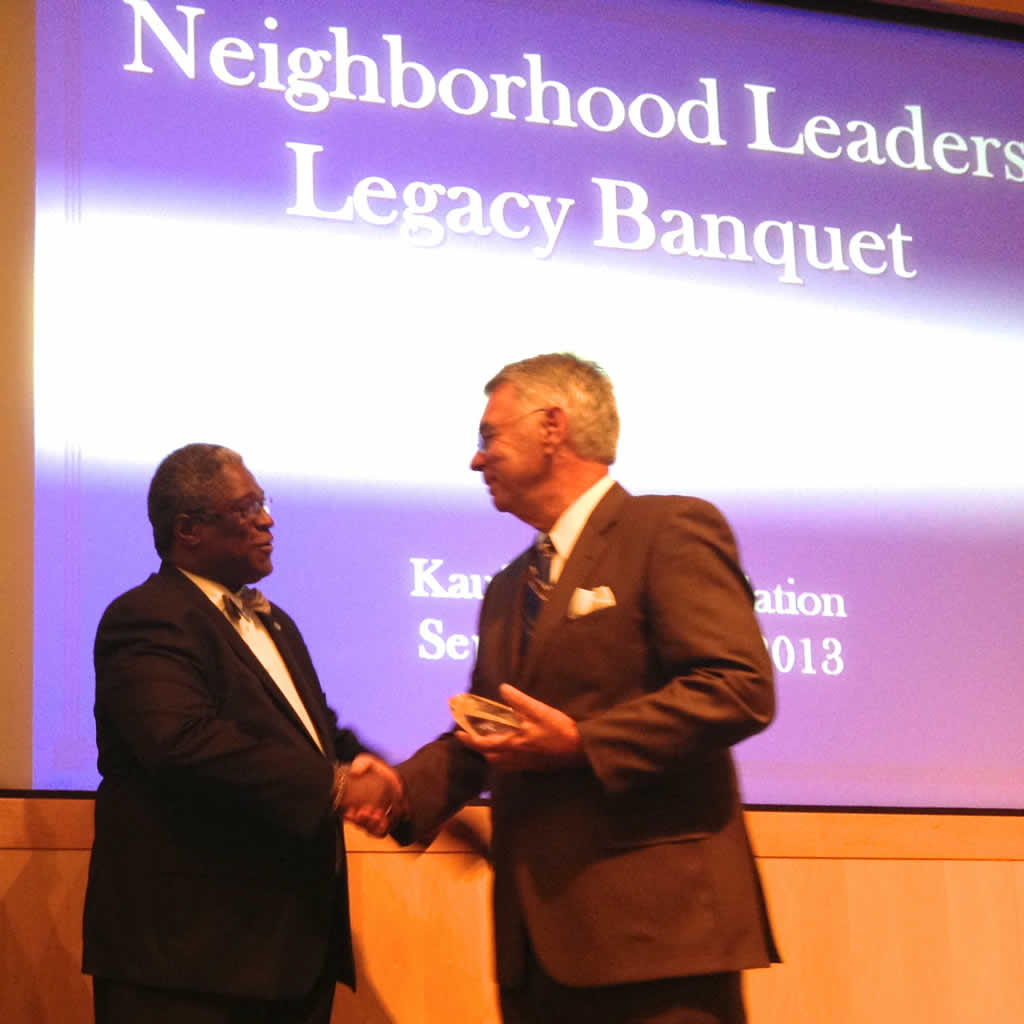 At a banquet at the Kauffman Foundation on September 28, 2013, Mayor Sly James presented Curt Watkins, co-founder and president of the Roanoke Park Conservancy, a 2013 Neighborhood Leader Legacy award. Curt said he represented all the volunteers who are working so diligently to clean up Roanoke Park, stating that the volunteers' goal was an even better mid-town life style that prizes green space in the midst of our dense urban neighborhoods.