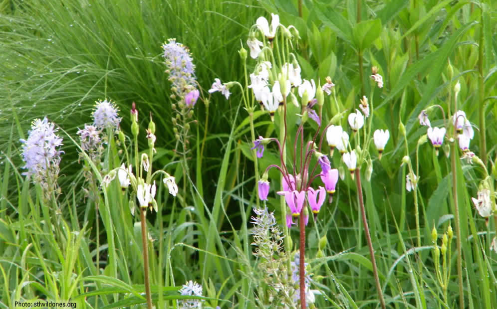 Dwarf Larkspur, Ohio Spiderwort, Wild Hyacinth, Thimbleweed, Starry Campion, Elephant's Foot, Elm-Leaf Goldenrod, Squaw Weed, Red Columbine, Jumpseed, Sky Blue Aster, White Beardtongue, Woodland Bergamot, Common Black-eyed Susan, Gray-headed Coneflower, Plains and Tickseed Coreopsis, Gray and Savanna Goldenrod, Leadplant, Slender Lespedeza, Partridge Pea, Purple Prairie Clover, Wild Quinine, Rattlesnake Master, Sampson’s Snakeroot, Sensitive Brier, Shooting Star, Downy Skullcap, Slender Mtn. Mint, Ox-eye Sunflower, Rose Verbena, and Yellow Wingstem.